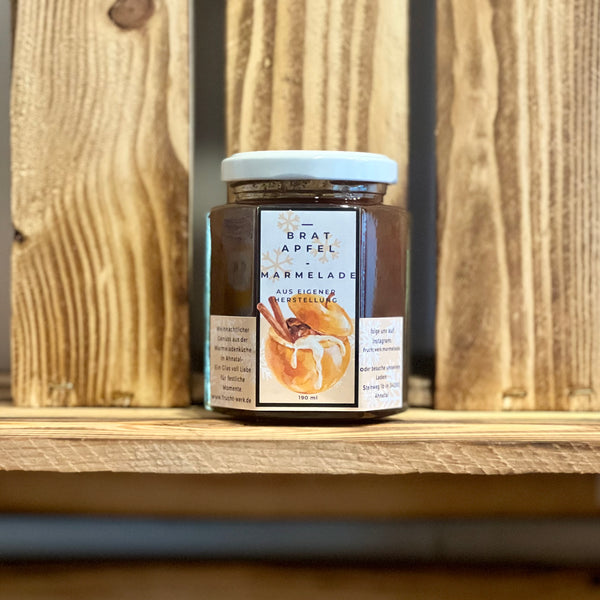 Unsere Bratapfel-Marmelade vereint den winterlichen Geschmack von süßen Äpfeln, Zimt und einem Hauch von weihnachtlichen Gewürzen. Diese handgemachte Marmelade bringt den Geschmack von frisch gebackenem Bratapfel auf den Frühstückstisch und eignet sich perfekt als aromatischer Aufstrich für Brot, Croissants oder als besondere Zutat für Desserts und Gebäck.