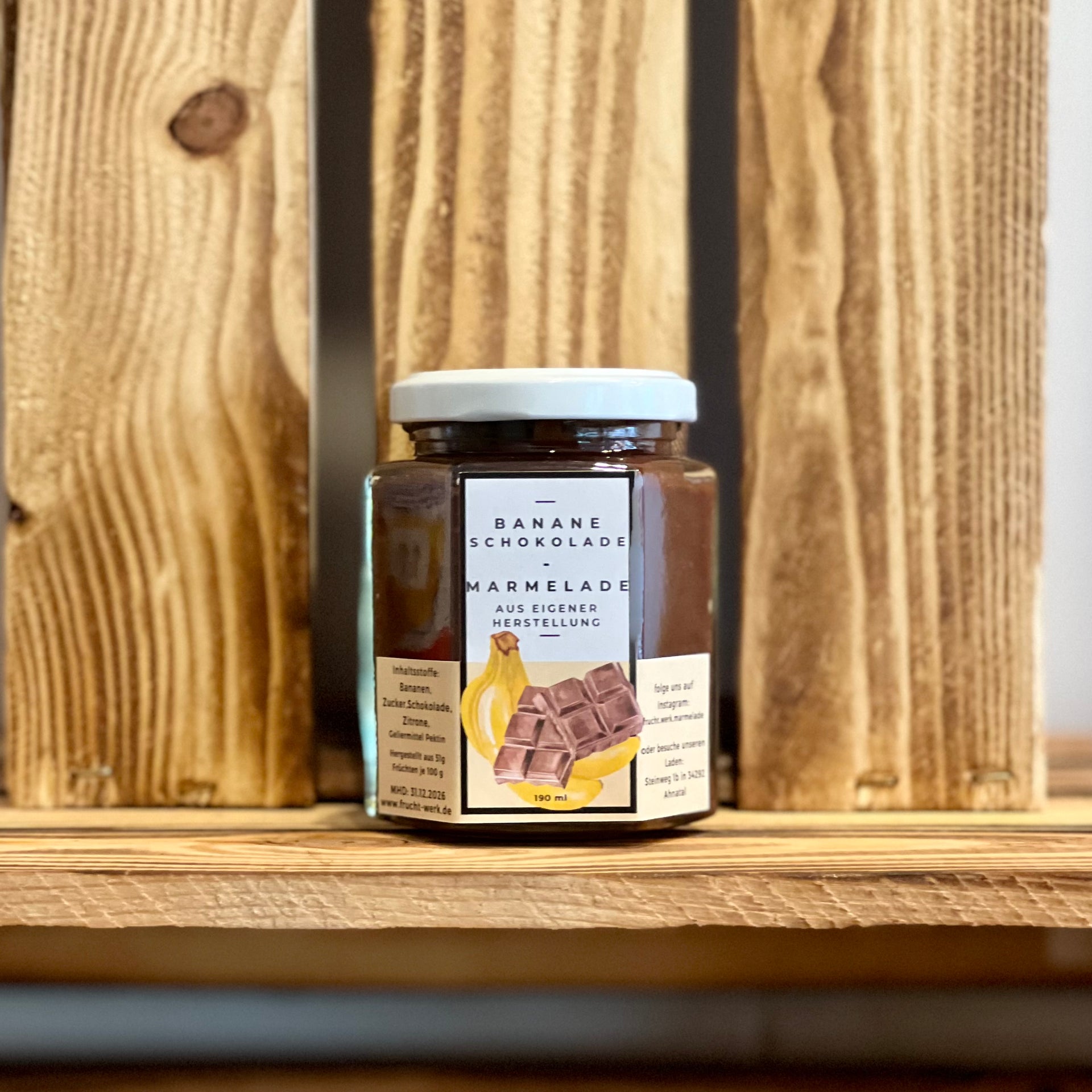 Zutaten: Bananen, Zucker, Schokolade, Geliermittel: Pektin, Zitronensaft.