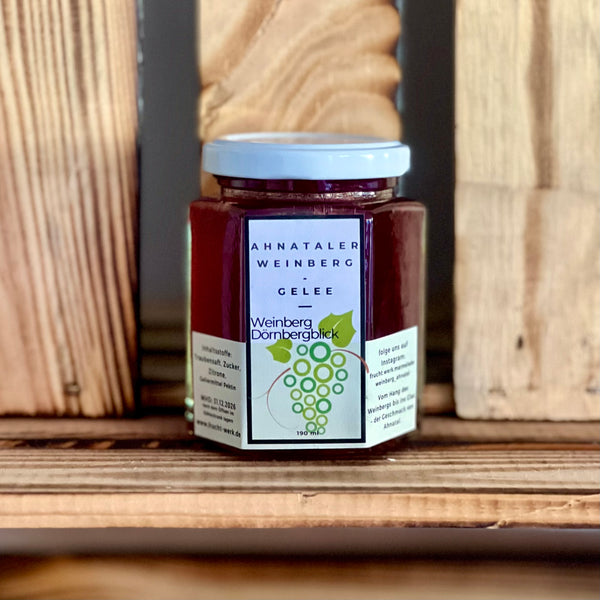 Verpackung: Das Ahnataler Weinberg Gelee ist in eleganten Gläsern abgefüllt, die sowohl eine edle Präsentation als auch eine lange Haltbarkeit garantieren – ideal zum Verschenken oder für den eigenen Genuss.