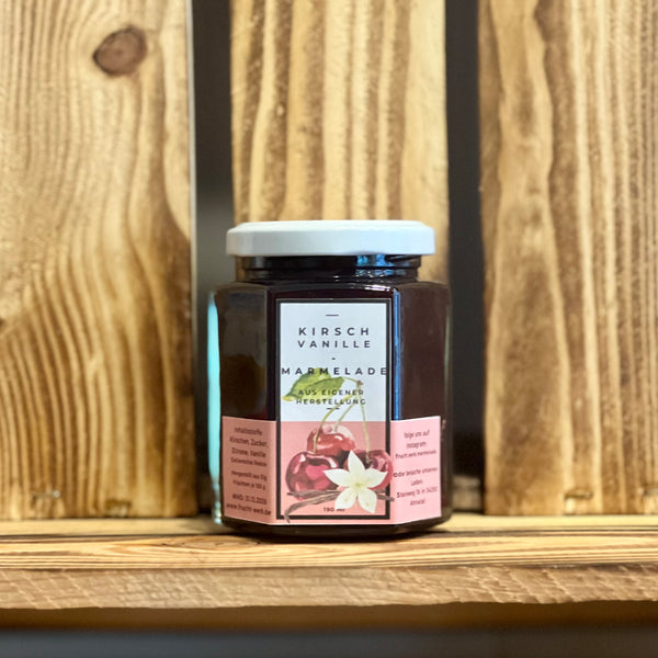 Unsere Kirsch-Vanille-Marmelade vereint den süßen, saftigen Geschmack reifer Kirschen mit der zarten, aromatischen Note von Vanille. Diese handgemachte Marmelade bietet ein harmonisches Geschmackserlebnis und eignet sich hervorragend als köstlicher Aufstrich für frisches Brot, Croissants oder als besondere Zutat für Desserts und Gebäck.