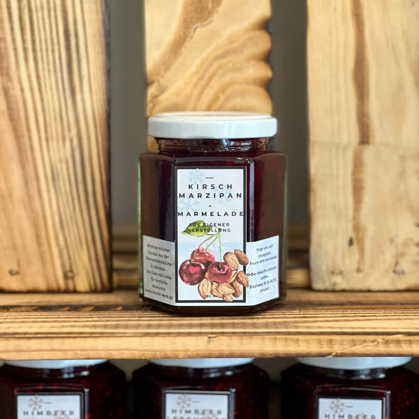 Unsere Kirsch-Marzipan-Marmelade aus der Kollektion Weihnachtsfruchtträume vereint den fruchtigen Geschmack reifer Kirschen mit der köstlichen Süße von Marzipan. Diese handgemachte Marmelade bringt einen Hauch von weihnachtlicher Eleganz und Genuss auf Ihren Tisch. Ideal als festlicher Aufstrich für frisches Brot, Croissants oder als besondere Zutat für Desserts und Gebäck zur Weihnachtszeit.
