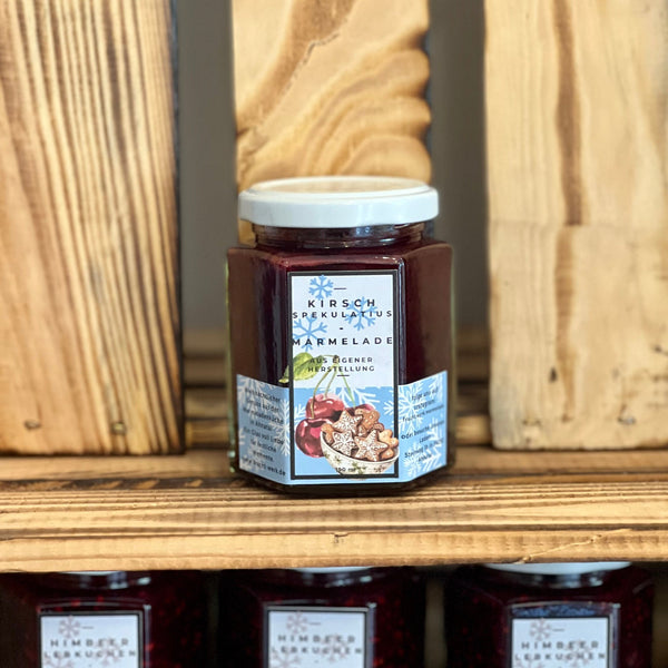 Unsere Kirsch-Spekulatius-Marmelade aus der Kollektion Weihnachtsfruchtträume kombiniert den fruchtigen Geschmack saftiger Kirschen mit der würzigen Note traditioneller Spekulatiusgewürze. Diese handgemachte Marmelade bringt einen festlichen Hauch auf Ihren Tisch und eignet sich hervorragend als köstlicher Aufstrich für frisches Brot, Croissants oder als besondere Zutat für winterliche Desserts und Gebäck.