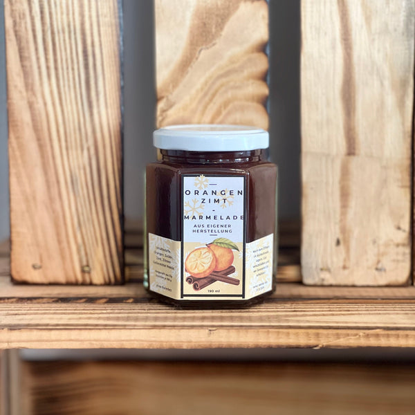 Unsere Orangen-Zimt-Marmelade aus der Kollektion Weihnachtsfruchtträume bringt den zauberhaften Geschmack von Weihnachten in jedes Frühstück. Die erfrischend fruchtigen Noten sonnengereifter Orangen vereinen sich mit der warmen, würzigen Note von Zimt und schaffen so ein festliches Geschmackserlebnis. Diese handgemachte Marmelade ist ideal für frisches Brot, Croissants oder als besondere Zutat für winterliche Desserts und Gebäck.